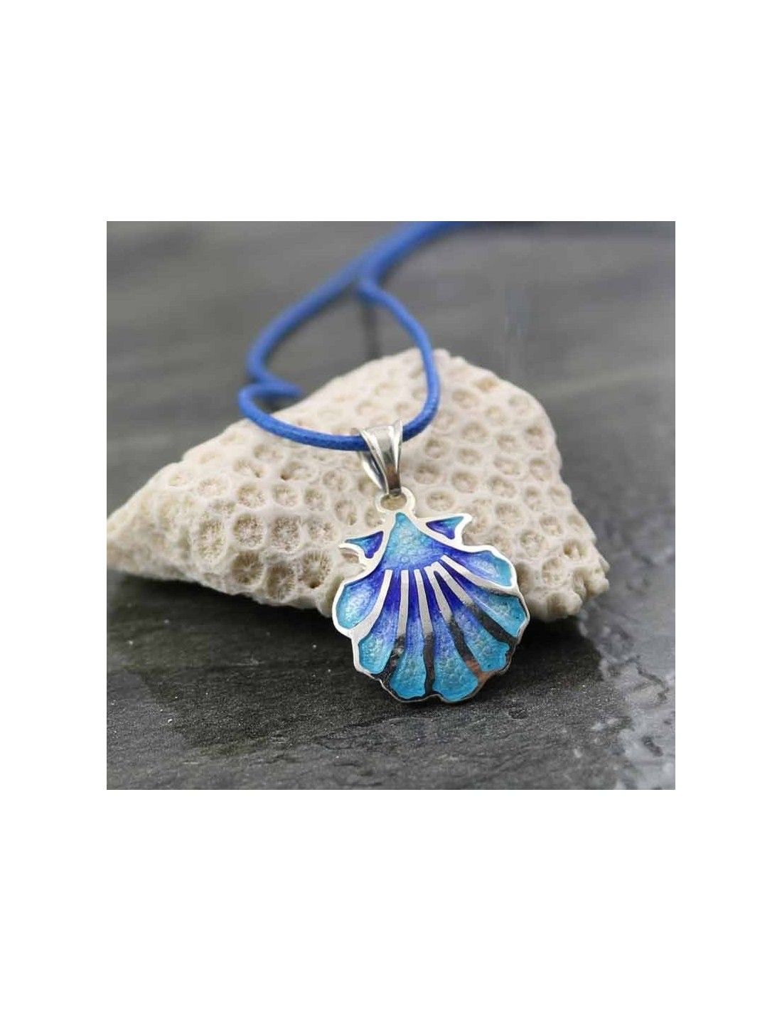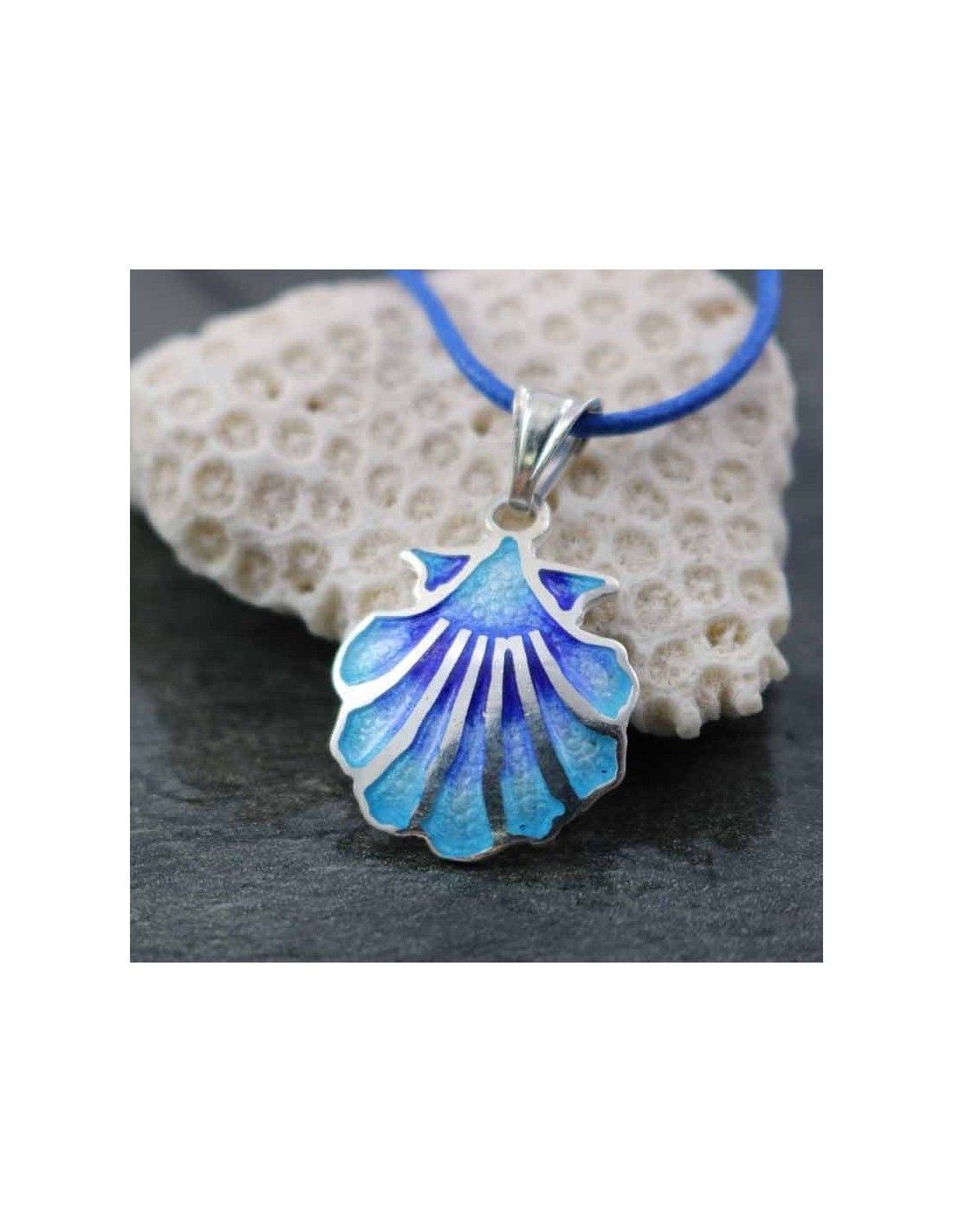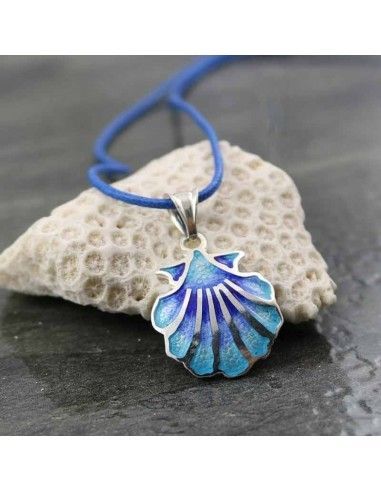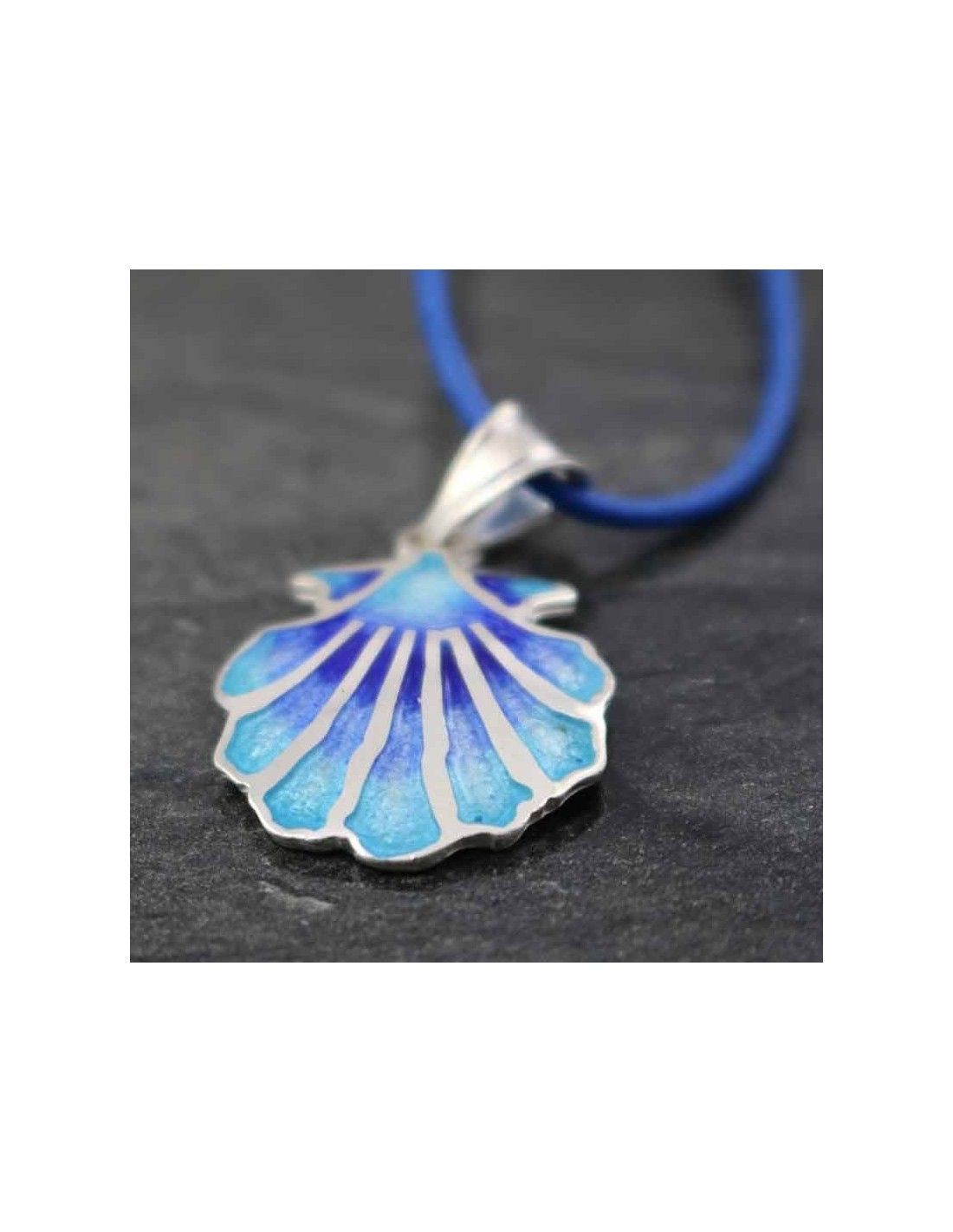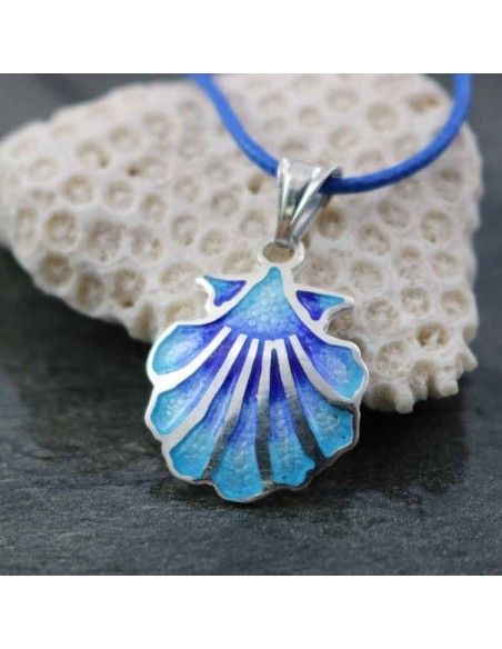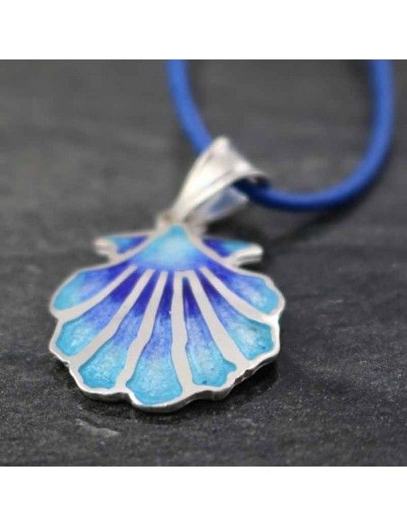 Colgante realizado en plata de ley 925 con la concha, símbolo del Camino de Santiago, esmaltada en varias tonalidades de azul difuminado.