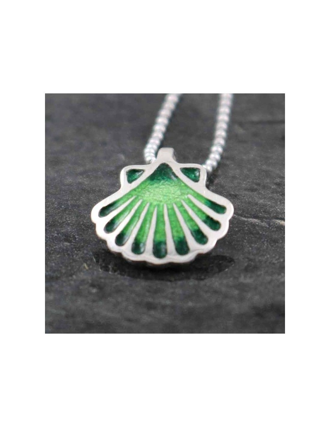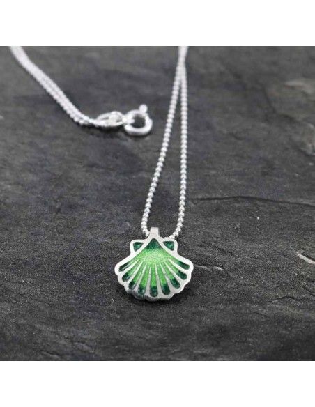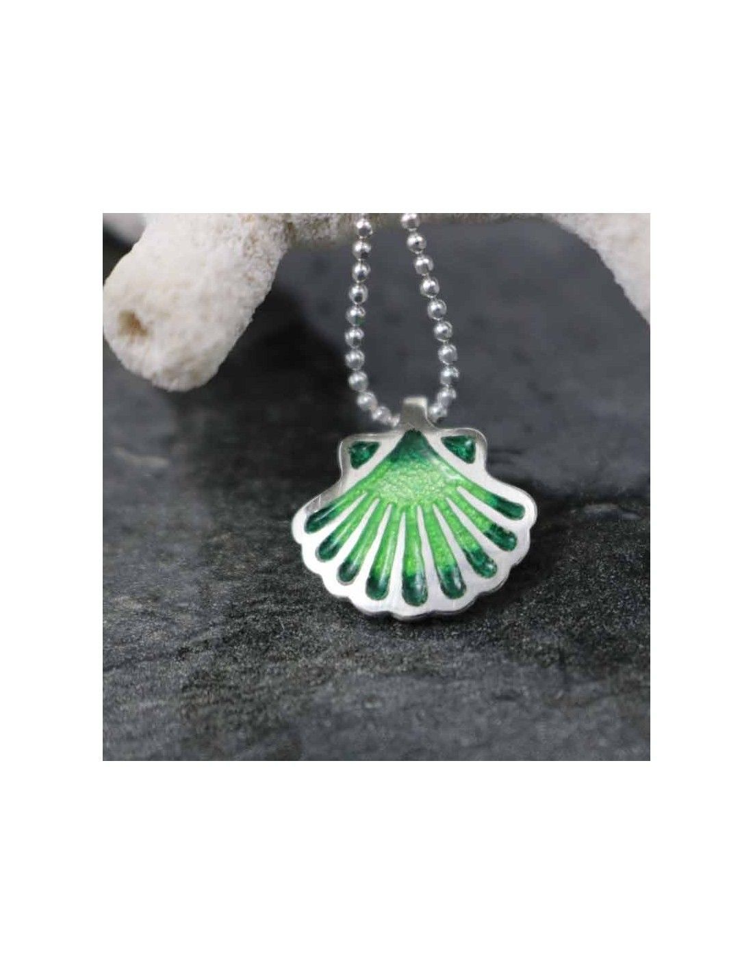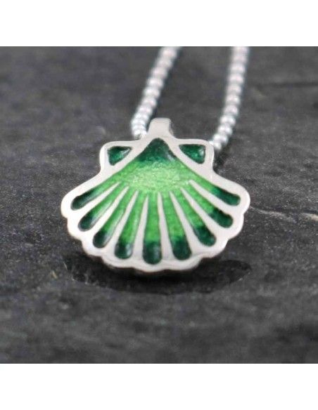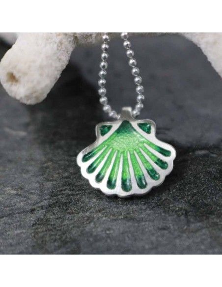 Colgante realizado en plata de ley 925 convla concha, símbolo del Camino de Santiago, esmaltada en varias tonalidades de verdes difuminados.